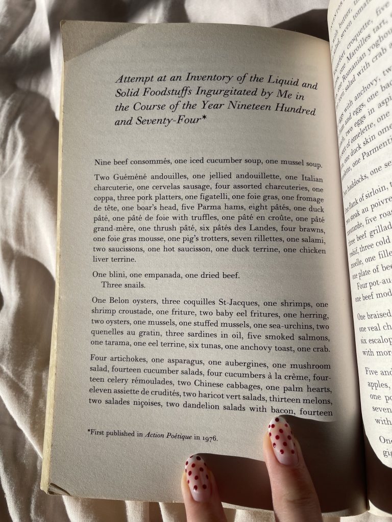 After the “Methods of investigating” brief, I continued reading Georges Perec’s “Species of Spaces” and particularly enjoyed the chapter “Attempt at an Inventory of the Liquid and Solid Foodstuffs Ingurgitated by Me in the Course of the Year Nineteen Hundred and Seventy-Four”, towards the end of the book, which describes every dish he ate in quantity over a year.