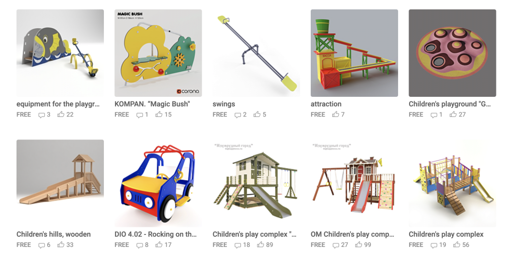 Looking through 3Dsky, I felt particularly drawn to the shapes and colours of the “playgrounds” category in the architecture section. I think playgrounds are one of the few accessible public spaces purely dedicated to play and design just to facilitate fun and exploration. In 2021 I saw Noguchi’s playground designs at the Barbican. He described the importance of “social function” in his work and that playgrounds were a type of functional sculpture and saw this as an important aspect of his work.
